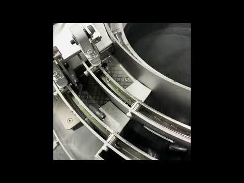 姿勢選別の為、振り子でワークを立たせ、2列→1列戻しで供給能力を上げております。(100個/分以上)