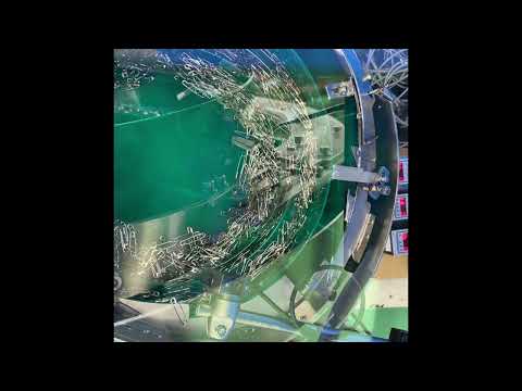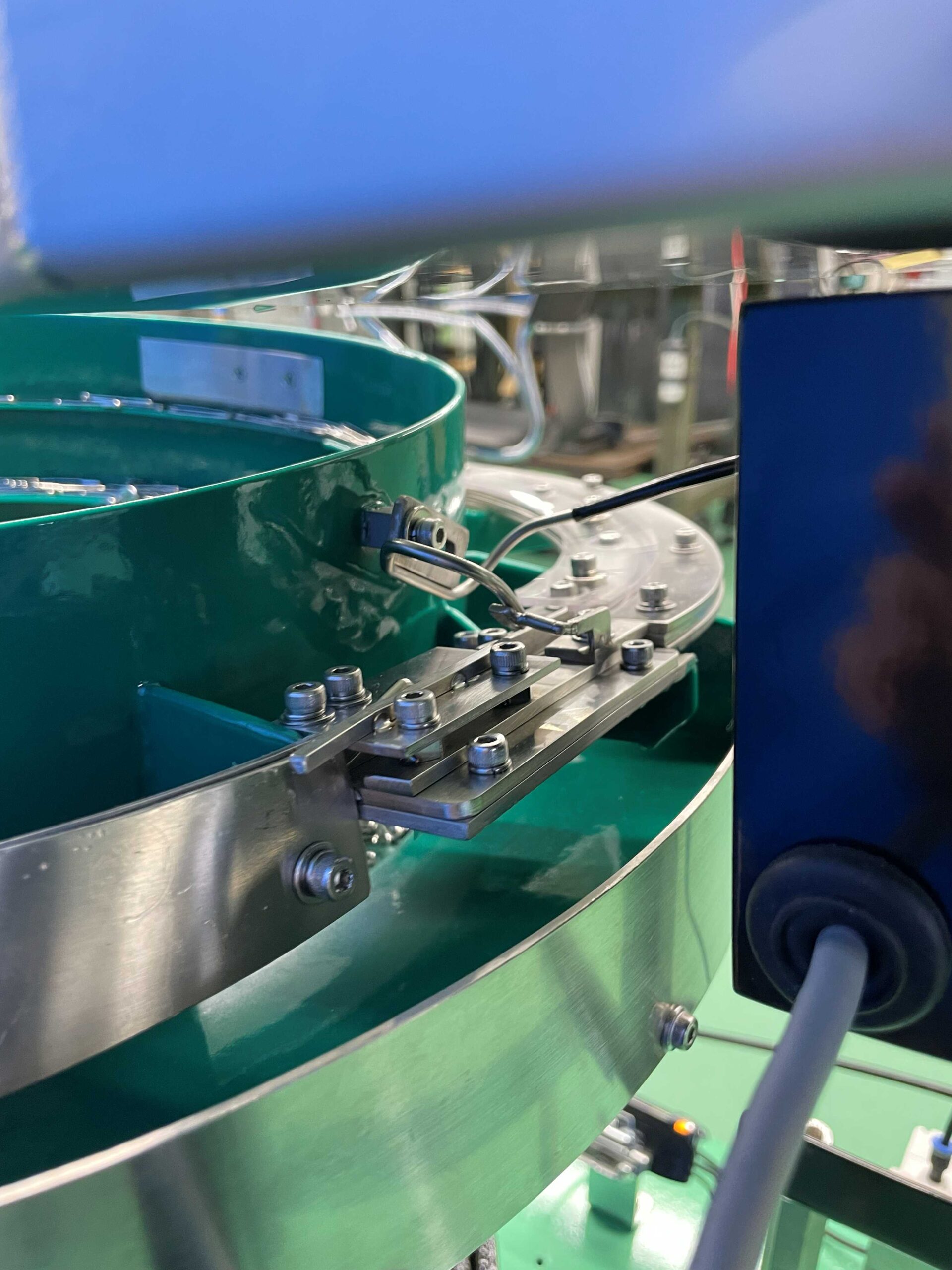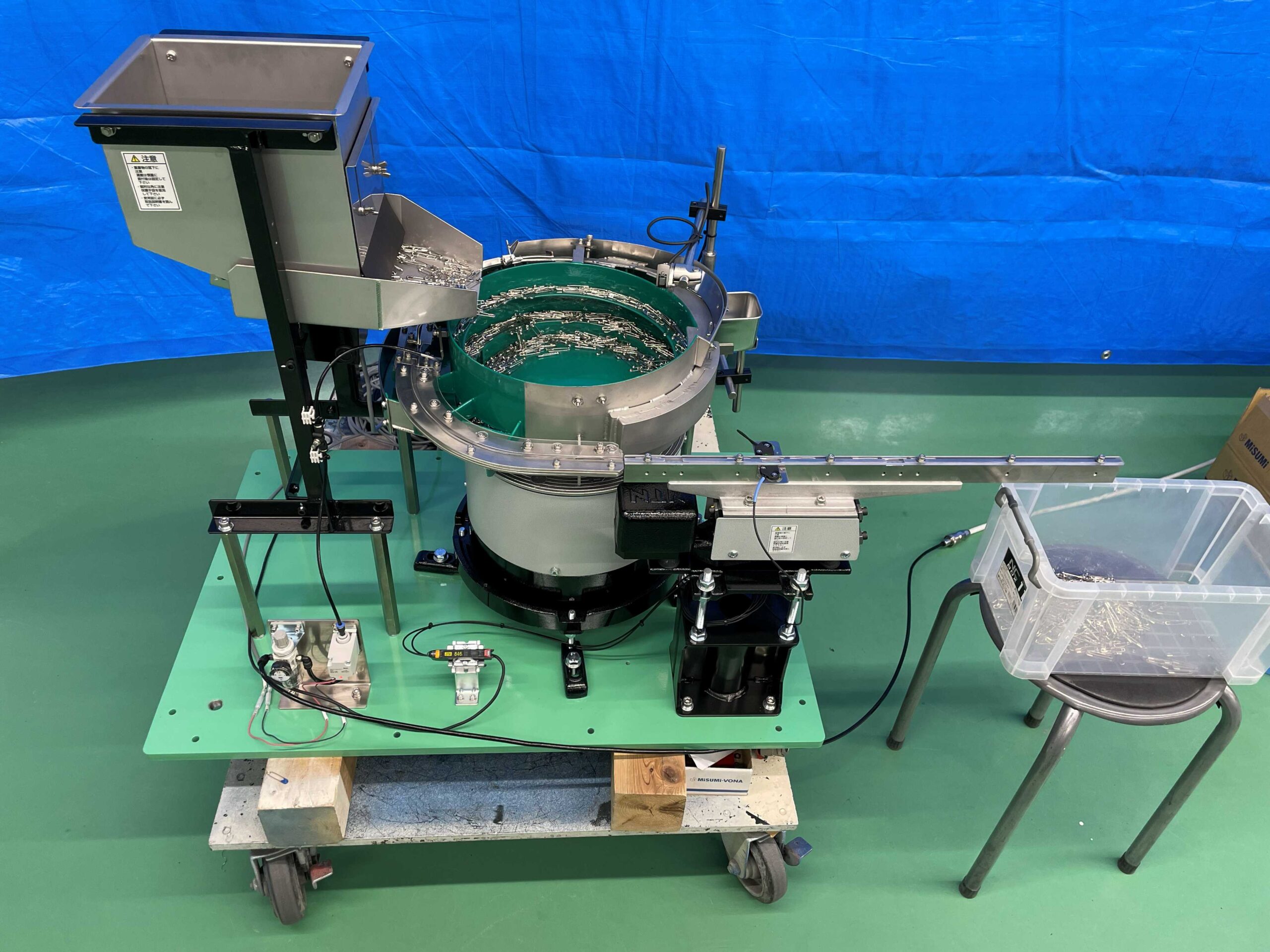 安全ピンの上下と前後を揃えて供給しております。線径が細く、一つ一つ形状が異なる為、供給難易度の高いワークとなりますが、高い職人の技で整列供給を実現しております。
